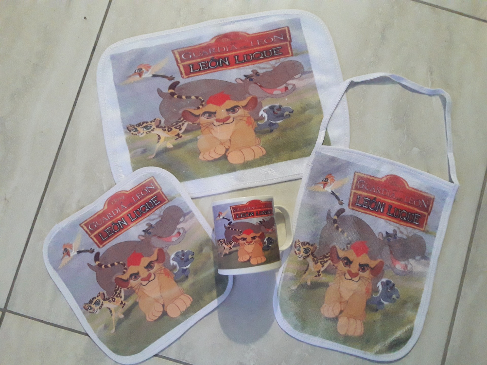 incluye taza plástica, individual, servilleta y toalla colgante